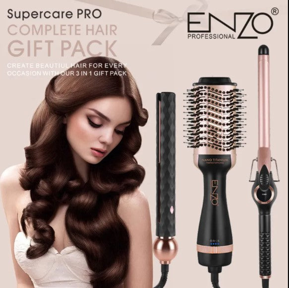 مجموعة ENZO 3 في 1 مع مكواة فرد الشعر ومشط فرد الشعر وثلاثة دلاء تجعيد الشعر